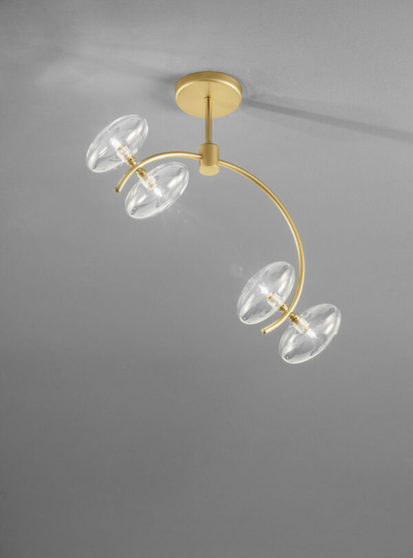 Aktualna dostępność: W magazynie znajduje się 1 sztuka lampy w złotym wykończeniu z 4 kloszami transparentnymi. Nie przegap okazji, aby wprowadzić ten elegancki element do swojego wnętrza!