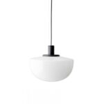 Ta elegancka lampa sufitowa wyróżnia się półkolistym abażurem, wykonanym z dmuchanego szkła opalowego, które dostępne jest w dwóch stylowych wariantach: mlecznym oraz przydymionym. Abażur jest zawieszony na aluminiowej konstrukcji malowanej proszkowo na głęboki, czarny kolor, co dodaje całości nowoczesnego charakteru.