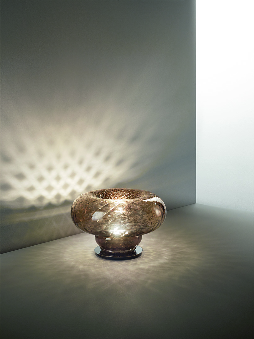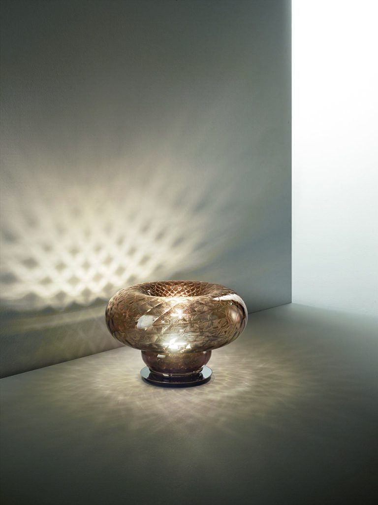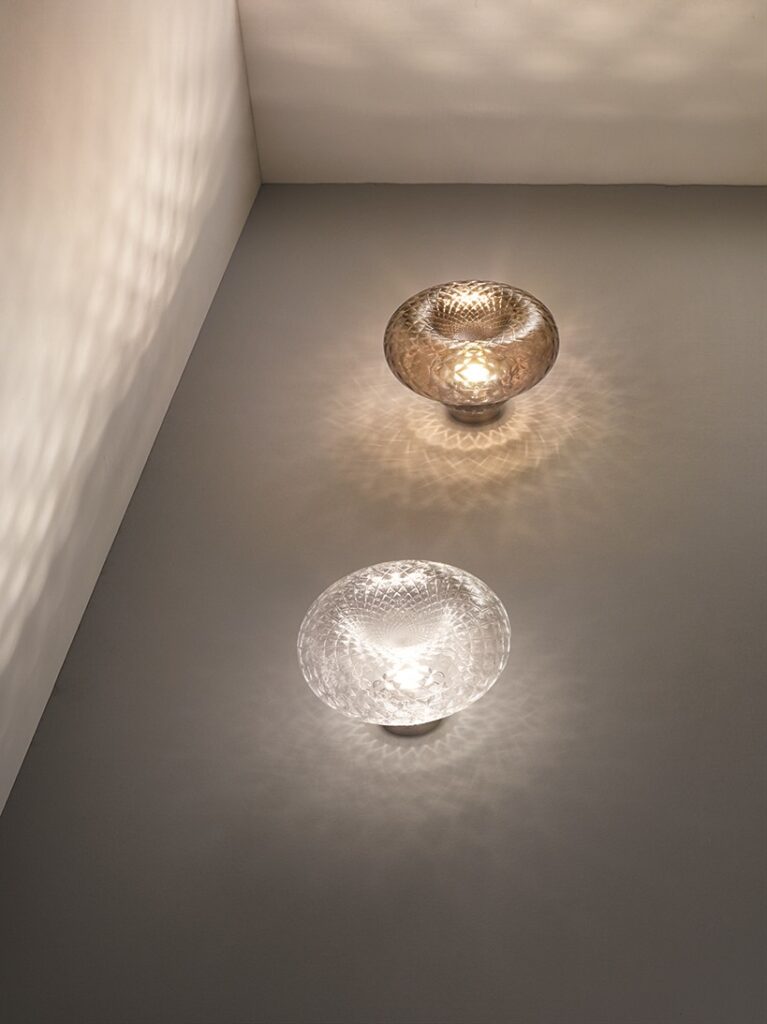 Wykonana z wysokiej jakości dmuchanego szkła weneckiego, lampa wyróżnia się unikalnymi detalami, w tym dwoma efektownymi występami, z których górny jest subtelnie wklęsły. Solidna podstawa z marmuru Carrara podkreśla jej luksusowy charakter.